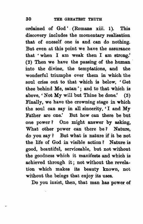 ordained of God ' - (Romans xiii. 1). This discovery includes the momentary realisation that of oneself one is and can do nothing. But even at this point we have the assurance that when I am weak then I am strong.' (2) Then we have the passing of the human into the divine, the temptations, and the wonderful triumphs over them in which the soul cries out to that which is below, ' Get thee behind Me, satan ' and to that which is above, ' Not My will but Thine be done.' (3) Finally, we have the crowning stage in which the soul can say in all sincerity, ' I and My Father are one.' But how can there be but one power? One might answer by asking, What other power can there be? Nature, do you say? But what is nature if it be not the life of God in visible action? Nature is good, beautiful, serviceable, but not without the goodness which it manifests and which is achieved through it not without the revelation which makes its beauty known, not without the beings that enjoy its uses. Do you insist, then, that man has power of