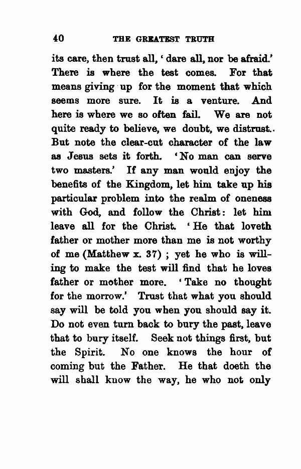 its care, then trust all, g dare all, nor be afraid.' There is where the test comes. For that means giving up for the moment that which seems more sure. It is a venture. And here is where we so often fail. We are not quite ready to believe, we doubt, we distrust. But note the clear-cut character of the law as Jesus sets it forth. ' No man can serve two masters.' If any man would enjoy the benefits of the Kingdom, let him take up his particular problem into the realm of oneness with God, and follow the Christ: let him leave all for the Christ. He that loveth father or mother more than me is not worthy of me (Matthew x. 37); yet he who is willing to make the test will find that he loves father or mother more. ' Take no thought for the morrow.' Trust that what you should say will be told you when you should say it. Do not even turn back to bury the past, leave that to bury itself. Seek not things first, but the Spirit. No one knows the hour of coming but the Father. He that doeth the will shall know the way, he who not only