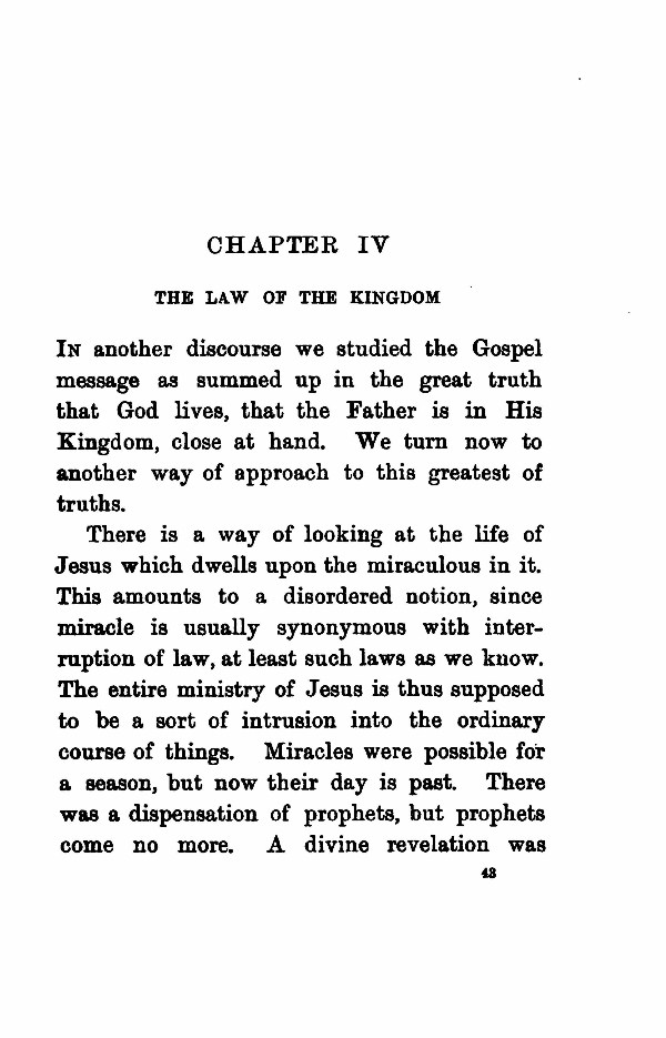 IN another discourse we studied the Gospel message as summed up in the great truth that God lives, that the Father is in His Kingdom, close at hand. We turn now to another way of approach to this greatest of truths. There is a way of looking at the life of Jesus which dwells upon the miraculous in it. This amounts to a disordered notion, since miracle is usually synonymous with interruption of law, at least such laws as we know. The entire ministry of Jesus is thus supposed to be a sort of intrusion into the ordinary course of things. Miracles were possible for a season, but now their day is past. There was a dispensation of prophets, but prophets come no more. A divine revelation was