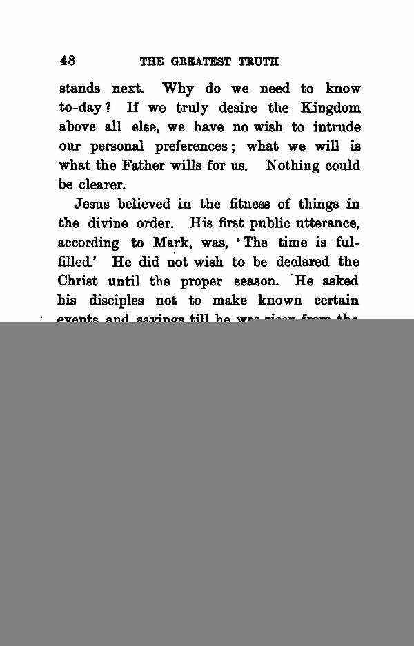 stands next. Why do we need to know to-day? If we truly desire the Kingdom above all else, we have no wish to intrude our personal preferences; what we will is what the Father wills for us. Nothing could be clearer. Jesus believed in the fitness of things in the divine order. His first public utterance, according to Mark, was, ' The time is fulfilled.' He did not wish to be declared the Christ until the proper season. He asked his disciples not to make known certain events and sayings till he was risen from the dead (Mark ix. 9.) He slips away from his pursuers a number of times. Yet, ` when the hour is come ' he is ready even to be betrayed and crucified (Mark xiv. 41.) The implication is that he regards the entire experience as part of the divine plan. The illustrations he draws to make clear that plan are taken from the everyday phenomena of growth round about him, the law of natural evolution. Again and again he assures his hearers that the law of action and reaction