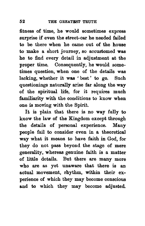 fitness of time, he would sometimes express surprise if even the street-car he needed failed to be there when he came out of the house to make a short journey, so accustomed was he to find every detail in adjustment at the proper time. Consequently, he would sometimes question, when one of the details was lacking, whether it was best ' to go. Such questionings naturally arise far along the way of the spiritual life, for it requires much familiarity with the conditions to know when one is moving with the Spirit. It is plain that there is no way fully to know the law of the Kingdom except through the details of personal experience. Many people fail to consider even in a theoretical way what it means to have faith in God, for they do not pass beyond the stage of mere generality, whereas genuine faith is a matter of little details. But there are many more who are as yet unaware that there is an actual movement, rhythm, within their experience of which they may become conscious and to which they may become adjusted.