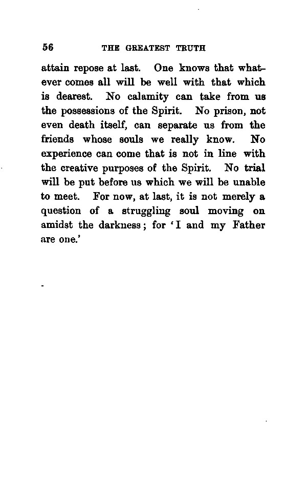 attain repose at last. One knows that what- ever comes all will be well with that which is dearest. No calamity can take from us the possessions of the Spirit. No prison, not even death itself, can separate us from the friends whose souls we really know. No experience can come that is not in line with the creative purposes of the Spirit. No trial will be put before us which we will be unable to meet. For now, at last, it is not merely a question of a struggling soul moving on amidst the darkness; for ' I and my Father are one.'