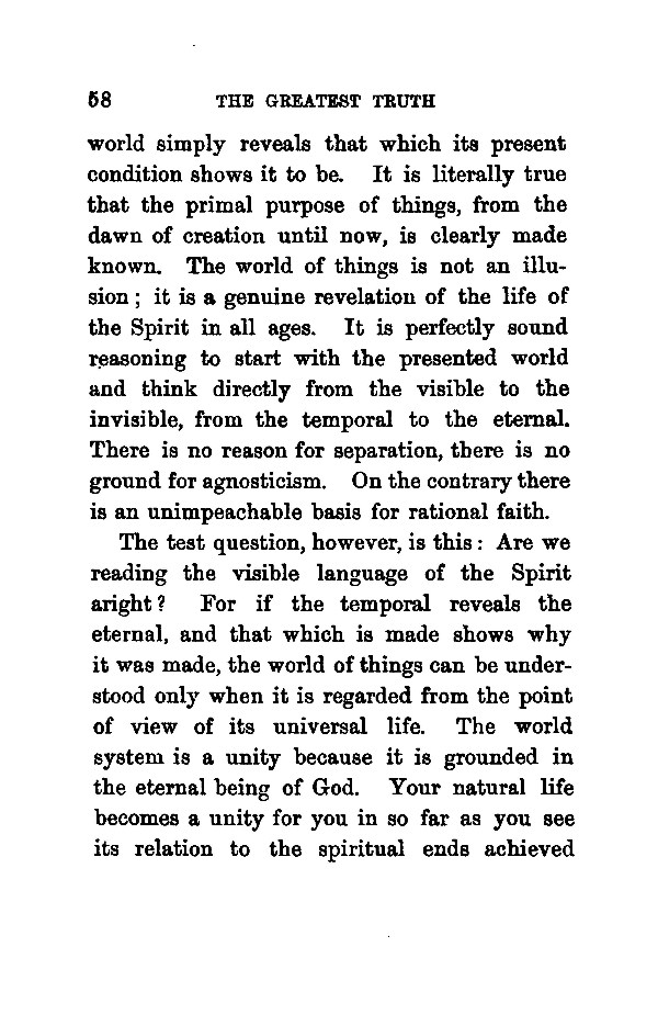 world simply reveals that which its present condition shows it to be. It is literally true that the primal purpose of things, from the dawn of creation until now, is clearly made known. The world of things is not an illusion it is a genuine revelation of the life of the Spirit in all ages. It is perfectly sound reasoning to start with the presented world and think directly from the visible to the invisible, from the temporal to the eternal. There is no reason for separation, there is no ground for agnosticism. On the contrary there is an unimpeachable basis for rational faith. The test question, however, is this: Are we reading the visible language of the Spirit aright? For if the temporal reveals the eternal, and that which is made shows why it was made, the world of things can be understood only when it is regarded from the point of view of its universal life. The world system is a unity because it is grounded in the eternal being of God. Your natural life becomes a unity for you in so far as you see its relation to the spiritual ends achieved