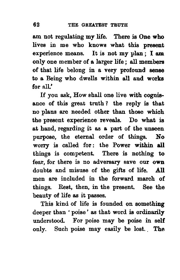 am not regulating my life. There is One who lives in me who knows what this present experience means. It is not my plan; I am only one member of a larger life; all members of that life belong in a very profound sense to a Being who dwells within all and works for al' If you ask, How shall one live with cognisance of this great truth? the reply is that no plans are needed other than those which the present experience reveals. Do what is at hand, regarding it as a part of the unseen purpose, the eternal order of things. No worry is called for: the Power within all things is competent. There is nothing to fear, for there is no adversary save our own doubts and misuse of the gifts of life. All men are included in the forward march of things. Rest, then, in the present. See the beauty of life as it passes. This kind of life is founded on something deeper than ' poise' as that word is ordinarily understood. For poise may be poise in self only. Such poise may easily be lost. The