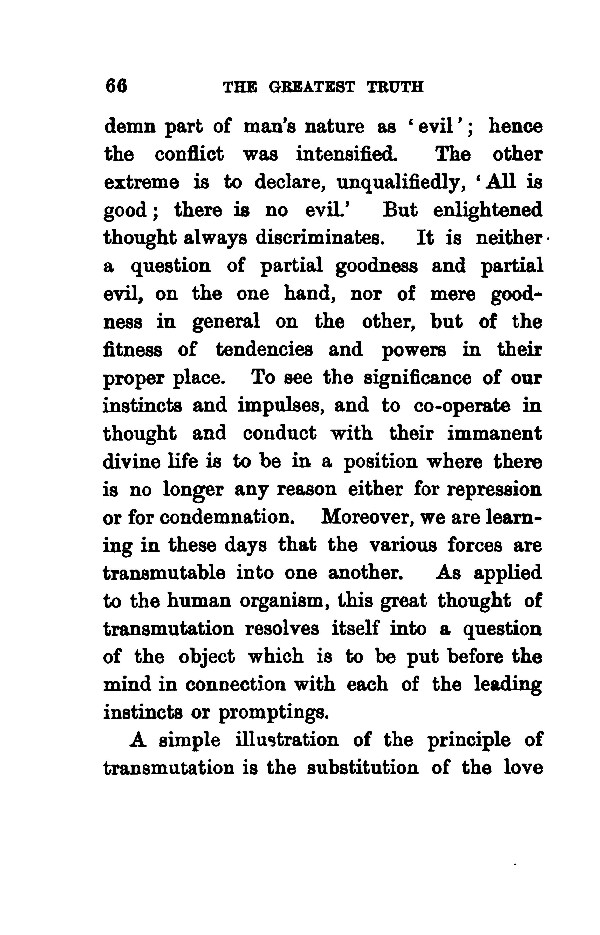 condemn part of man's nature as ' evil'; hence the conflict was intensified. The other extreme is to declare, unqualifiedly, ' All is good; there is no evil.' But enlightened thought always discriminates. It is neither a question of partial goodness and partial evil, on the one hand, nor of mere goodness in general on the other, but of the fitness of tendencies and powers in their proper place. To see the significance of our instincts and impulses, and to co-operate in thought and conduct with their immanent divine life is to be in a position where there is no longer any reason either for repression or for condemnation. Moreover, we are learning in these days that the various forces are transmutable into one another. As applied to the human organism, this great thought of transmutation resolves itself into a question of the object which is to be put before the mind in connection with each of the leading instincts or promptings. A simple illustration of the principle of transmutation is the substitution of the love