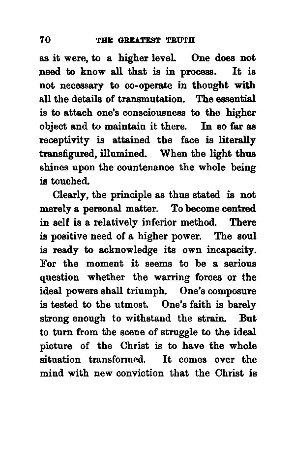 as it were, to a higher level. One does not need to know all that is in process. It is not necessary to co-operate in thought with all the details of transmutation. The essential is to attach one's consciousness to the higher object and to maintain it there. In so far as receptivity is attained the face is literally transfigured, illumined. When the light thus shines upon the countenance the whole being is touched. Clearly, the principle as thus stated is not merely a personal matter. To become centred in self is a relatively inferior method. There is positive need of a higher power. The soul is ready to acknowledge its own incapacity. For the moment it seems to be a serious question whether the warring forces or the ideal powers shall triumph. One's composure is tested to the utmost. One's faith is barely strong enough to withstand the strain. But to turn from the scene of struggle to the ideal picture of the Christ is to have the whole situation transformed. It comes over the mind with new conviction that the Christ is