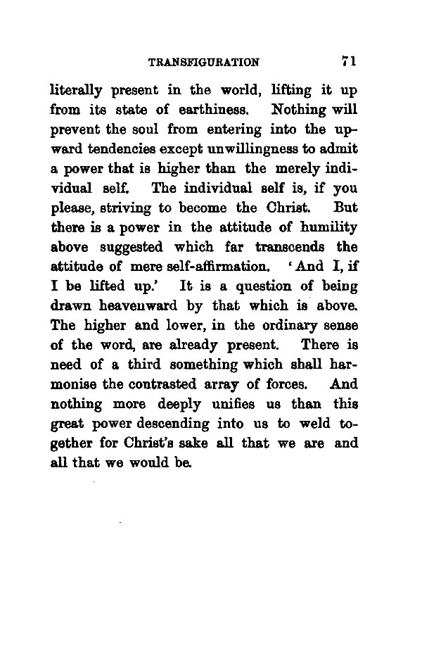 literally present in the world, lifting it up from its state of earthiness. Nothing will prevent the soul from entering into the upward tendencies except unwillingness to admit a power that is higher than the merely individual self. The individual self is, if you please, striving to become the Christ. But there is a power in the attitude of humility above suggested which far transcends the attitude of mere self-affirmation. And I, if I be lifted up.' It is a question of being drawn heavenward by that which is above. The higher and lower, in the ordinary sense of the word, are already present. There is need of a third something which shall harmonise the contrasted array of forces. And nothing more deeply unifies us than this great power descending into us to weld together for Christ's sake all that we are and all that we would be.