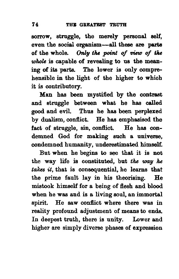 sorrow, straggle, the merely personal self, even the social organism --- all these are parts of the whole. Only the point of mew of the whole is capable of revealing to us the meaning of its parts. The lower is only comprehensible in the light of the higher to which it is contributory. Man has been mystified by the contrast and struggle between what he has called good and evil. Thus he has been perplexed by dualism, conflict. He has emphasised the fact of struggle, sin, conflict. He has condemned God for making such a universe, condemned humanity, underestimated himself. But when he begins to see that it is not the way life is constituted, but the way he takes it, that is consequential, he learns that the prime fault lay in his theorising. He mistook himself for a being of flesh and blood when he was and is a living soul, an immortal spirit. He saw conflict where there was in reality profound adjustment of means to ends. In deepest truth, there is unity. Lower and higher are simply diverse phases of expression