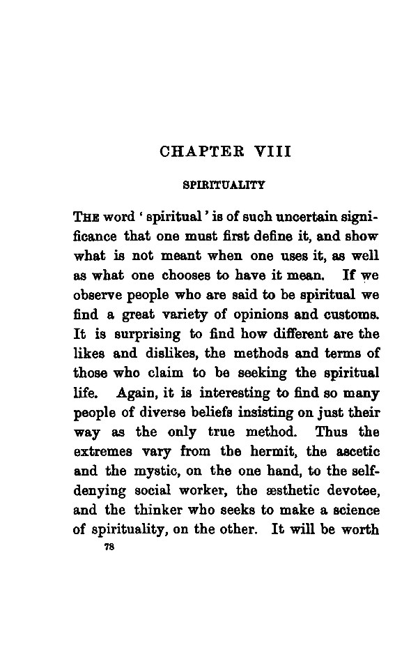 THE word ' spiritual' is of such uncertain significance that one must first define it, and show what is not meant when one uses it, as well as what one chooses to have it mean. If we observe people who are said to be spiritual we find a great variety of opinions and customs. It is surprising to find how different are the likes and dislikes, the methods and terms of those who claim to be seeking the spiritual life. Again, it is interesting to find so many people of diverse beliefs insisting on just their way as the only true method. Thus the extremes vary from the hermit, the ascetic and the mystic, on the one hand, to the self- denying social worker, the aesthetic devotee, and the thinker who seeks to make a science of spirituality, on the other. It will be worth