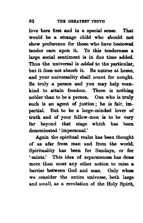 love hers first and in a special sense. That would be a strange child who should not show preference for those who have bestowed tender care upon it. To this tenderness a large social sentiment is in due time added. Thus the universal is added to the particular, but it does not absorb it. Be untrue at home, and your universality shall count for nought. Be truly a person and you may help mankind to attain freedom. There is nothing nobler than to be a person. One who is truly such is an agent of justice; he is fair, im- partial. But to be a large-minded lover of truth and of your fellow-men is to be very far beyond that stage which has been denominated ` impersonal' Again the spiritual realm has been thought of as afar from man and from the world. Spirituality has been for Sundays, or for ` saints.' This idea of separateness has done more than most any other notion to raise a barrier between God and man. Only when we consider the entire universe, both large and small, as a revelation of the Holy Spirit,