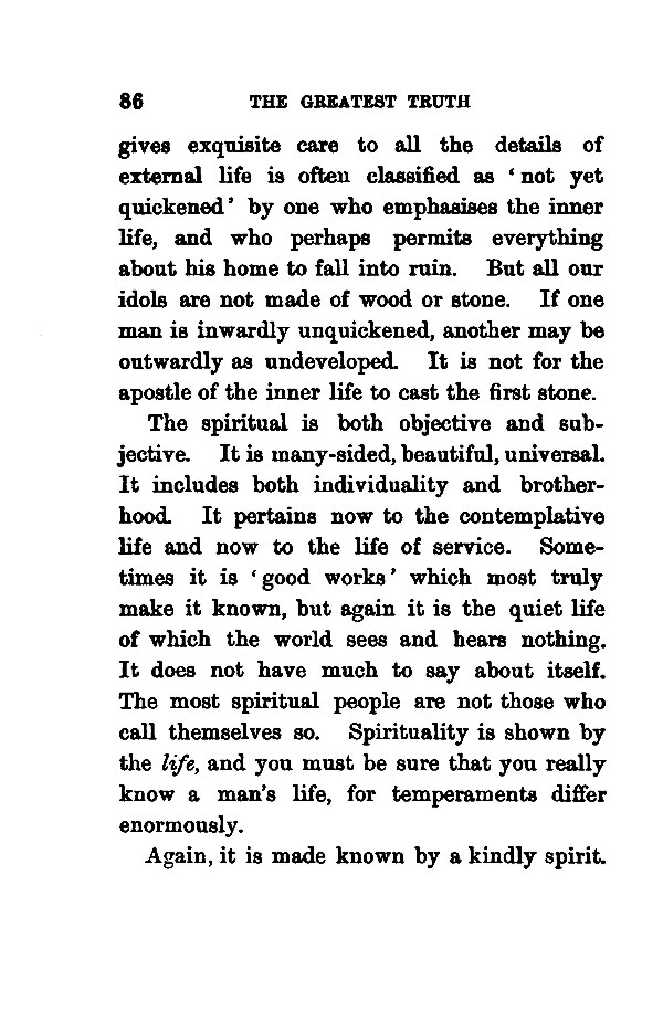 gives exquisite care to all the details of external life is often classified as ' not yet quickened' by one who emphasises the inner life, and who perhaps permits everything about his home to fall into ruin. But all our idols are not made of wood or stone. If one man is inwardly unquickened, another may be outwardly as undeveloped. It is not for the apostle of the inner life to cast the first stone. The spiritual is both objective and subjective. It is many-sided, beautiful, universal. It includes both individuality and brotherhood. It pertains now to the contemplative life and now to the life of service. Sometimes it is good works' which most truly make it known, but again it is the quiet life of which the world sees and hears nothing. It does not have much to say about itself. The most spiritual people are not those who call themselves so. Spirituality is shown by the life, and you must be sure that you really know a man's life, for temperaments differ enormously. Again, it is made known by a kindly spirit.