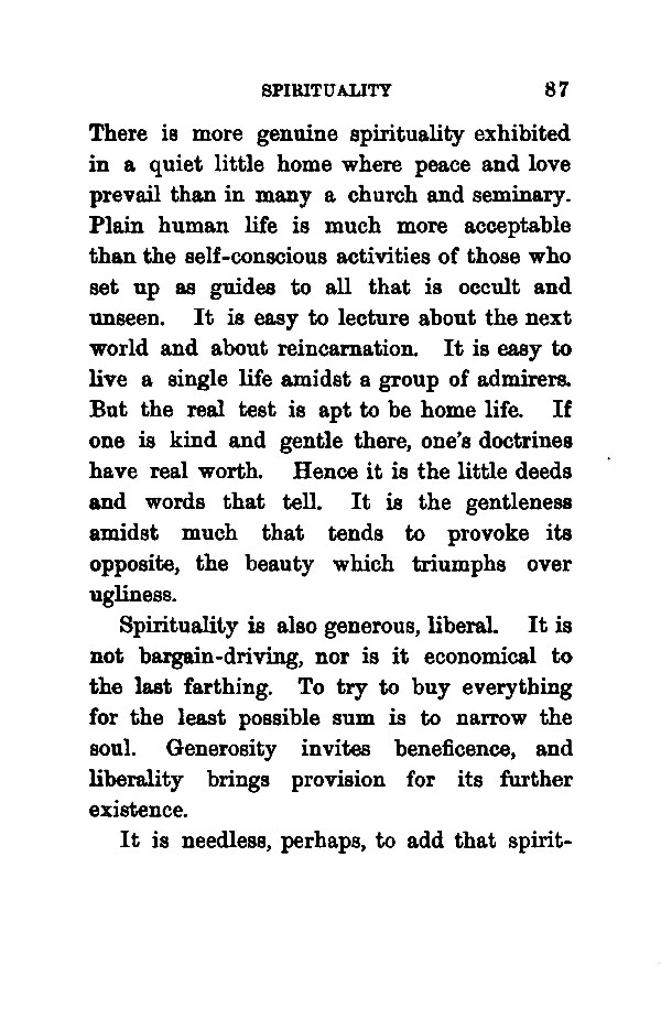 There is more genuine spirituality exhibited in a quiet little home where peace and love prevail than in many a church and seminary. Plain human life is much more acceptable than the self-conscious activities of those who set up as guides to all that is occult and unseen. It is easy to lecture about the next world and about reincarnation. It is easy to live a single life amidst a group of admirers. But the real test is apt to be home life. If one is kind and gentle there, one's doctrines have real worth. Hence it is the little deeds and words that tell. It is the gentleness amidst much that tends to provoke its opposite, the beauty which triumphs over ugliness. Spirituality is also generous, liberal. It is not bargain-driving, nor is it economical to the last farthing. To try to buy everything for the least possible sum is to narrow the soul. Generosity invites beneficence, and liberality brings provision for its further existence. It is needless, perhaps, to add that spirituality