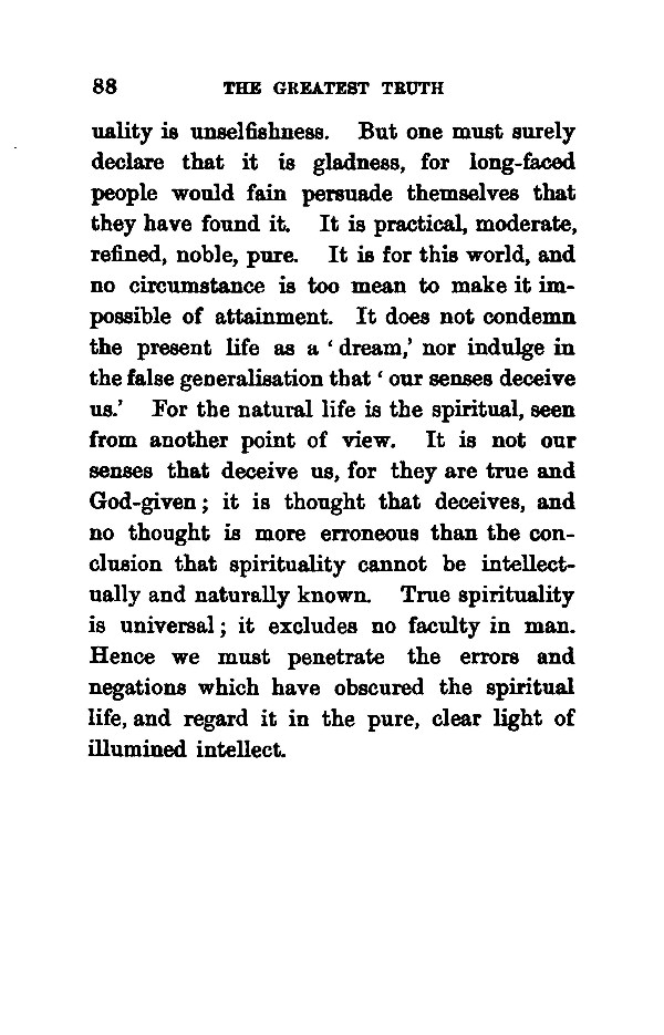is unselfishness. But one must surely declare that it is gladness, for long-faced people would fain persuade themselves that they have found it. It is practical, moderate, refined, noble, pure. It is for this world, and no circumstance is too mean to make it impossible of attainment. It does not condemn the present life as a ' dream,' nor indulge in the false generalisation that ' our senses deceive us.' For the natural life is the spiritual, seen from another point of view. It is not our senses that deceive us, for they are true and God-given; it is thought that deceives, and no thought is more erroneous than the conclusion that spirituality cannot be intellect- ually and naturally known. True spirituality is universal; it excludes no faculty in man. Hence we must penetrate the errors and negations which have obscured the spiritual life, and regard it in the pure, clear light of illumined intellect.