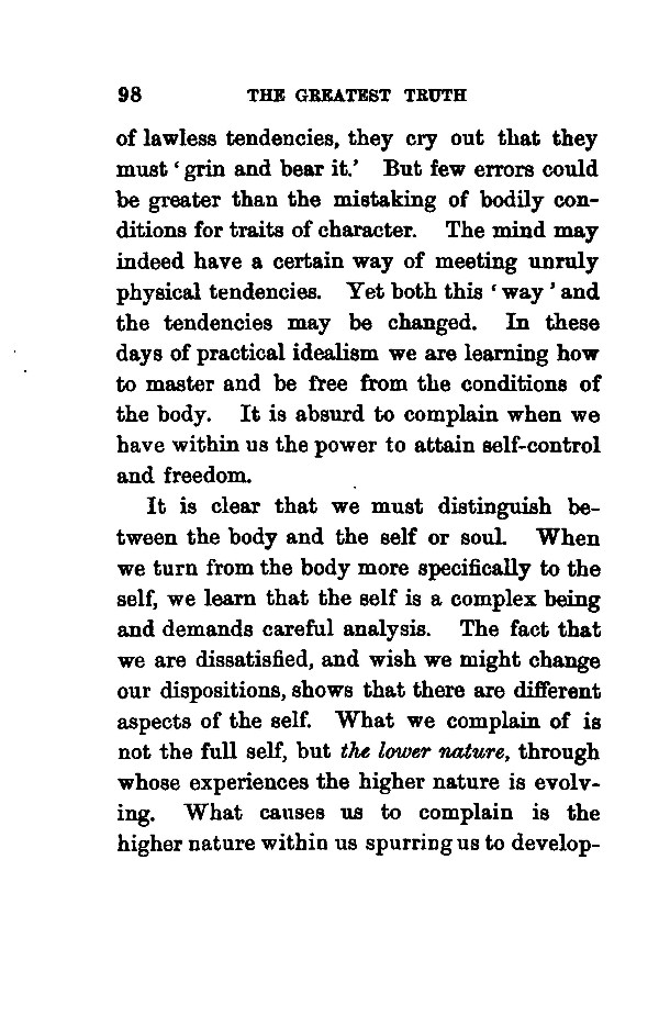 of lawless tendencies, they cry out that they must ' grin and bear it.' But few errors could be greater than the mistaking of bodily conditions for traits of character. The mind may indeed have a certain way of meeting unruly physical tendencies. Yet both this ' way ' and the tendencies may be changed. In these days of practical idealism we are learning how to master and be free from the conditions of the body. It is absurd to complain when we have within us the power to attain self-control and freedom. It is clear that we must distinguish be- tween the body and the self or soul. When we turn from the body more specifically to the self, we learn that the self is a complex being and demands careful analysis. The fact that we are dissatisfied, and wish we might change our dispositions, shows that there are different aspects of the self. What we complain of is not the full self, but the lower nature, through whose experiences the higher nature is evolving. What causes us to complain is the higher nature within us spurring us to development.