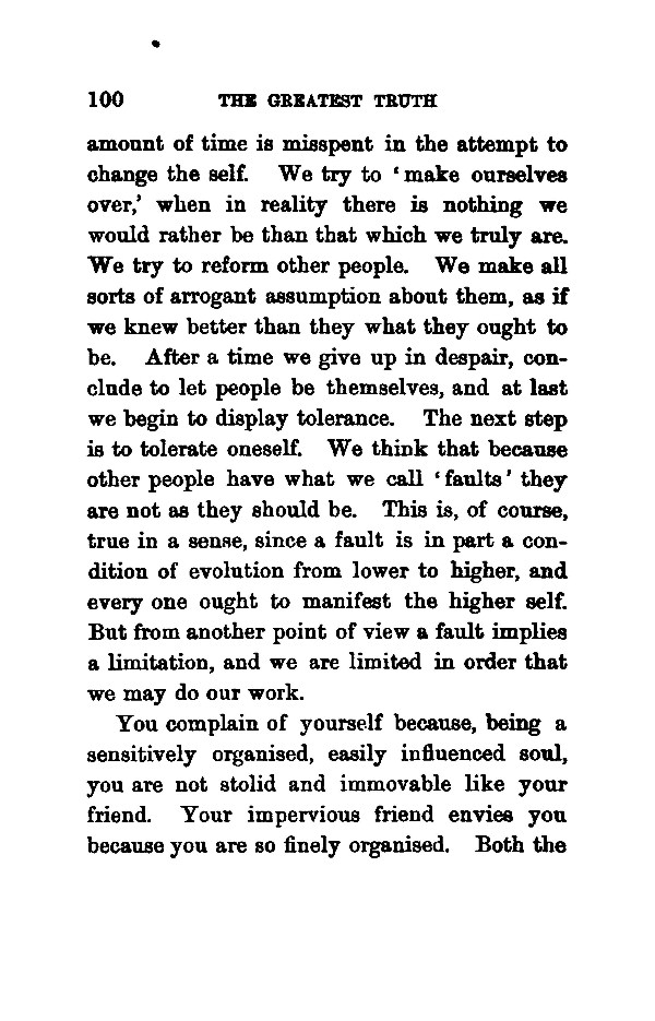 amount of time is misspent in the attempt to change the self. We try to ' make ourselves over,' when in reality there is nothing we would rather be than that which we truly are. We try to reform other people. We make all sorts of arrogant assumption about them, as if we knew better than they what they ought to be. After a time we give up in despair, conclude to let people be themselves, and at last we begin to display tolerance. The next step is to tolerate oneself. We think that because other people have what we call ' faults' they are not as they should be. This is, of course, true in a sense, since a fault is in part a condition of evolution from lower to higher, and every one ought to manifest the higher self. But from another point of view a fault implies a limitation, and we are limited in order that we may do our work. You complain of yourself because, being a sensitively organised, easily influenced soul, you are not stolid and immovable like your friend. Your impervious friend envies you because you are so finely organised. Both the