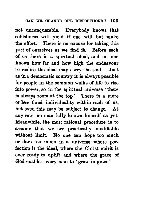 not unconquerable. Everybody knows that selfishness will yield if one will but make the effort. There is no excuse for taking this part of ourselves as we find it. Before each of us there is a spiritual ideal, and no one knows how far and how high the endeavour to realise the ideal may carry the soul. Just as in a democratic country it is always possible for people in the common walks of life to rise into power, so in the spiritual universe I there is always room at the top.' There is a more or less fixed individuality within each of us, but even this may be subject to change. At any rate, no man fully knows himself as yet. Meanwhile, the most rational procedure is to ' assume that we are practically modifiable without limit. No one can hope too much or dare too much in a universe where perfection is the ideal, where the Christ spirit is ever ready to uplift, and where the grace of God enables every man to ' grow in grace.'