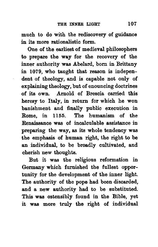 much to do with the rediscovery of guidance in its more rationalistic form. One of the earliest of medieval philosophers to prepare the way for the recovery of the inner authority was Abelard, born in Brittany in 1079, who taught that reason is independent of theology, and is capable not only of explaining theology, but of enouncing doctrines of its own. Arnold of Brescia carried this heresy to Italy, in return for which he won banishment and finally public execution in Rome, in 1155. The humanism of the Renaissance was of incalculable assistance in preparing the way, as its whole tendency was the emphasis of human right, the right to be an individual, to be broadly cultivated, and cherish new thoughts. But it was the religious reformation in Germany which furnished the fullest opportunity for the development of the inner light. The authority of the pope had been discarded, and a new authority had to be substituted. This was ostensibly found in the Bible, yet it was more truly the right of individual