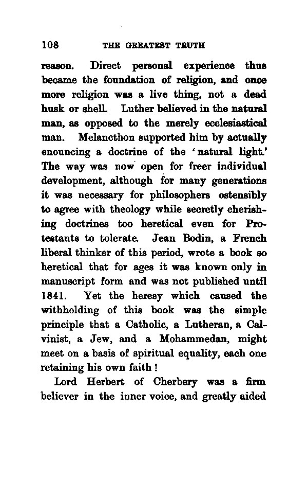 reason. Direct personal experience thus became the foundation of religion, and once more religion was a live thing, not a dead husk or shell. Luther believed in the natural man, as opposed to the merely ecclesiastical man. Melancthon supported him by actually enouncing a doctrine of the ' natural light.' The way was now open for freer individual development, although for many generations it was necessary for philosophers ostensibly to agree with theology while secretly cherishing doctrines too heretical even for Protestants to tolerate. Jean Bodin, a French liberal thinker of this period, wrote a book so heretical that for ages it was known only in manuscript form and was not published until 1841. Yet the heresy which caused the withholding of this book was the simple principle that a Catholic, a Lutheran, a Cal- vinist, a Jew, and a Mohammedan, might meet on a basis of spiritual equality, each one retaining his own faith! Lord Herbert of Cherbery was a firm believer in the inner voice, and greatly aided