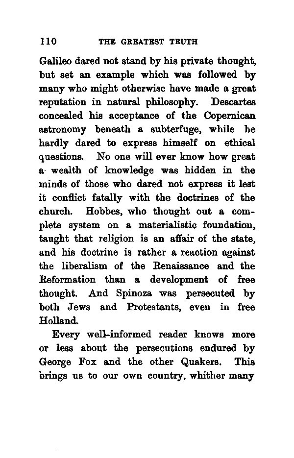 Galileo dared not stand by his private thought, but set an example which was followed by many who might otherwise have made a great reputation in natural philosophy. Descartes concealed his acceptance of the Copernican astronomy beneath a subterfuge, while he hardly dared to express himself on ethical questions. No one will ever know how great a wealth of knowledge was hidden in the minds of those who dared not express it lest it conflict fatally with the doctrines of the church. Hobbes, who thought out a complete system on a materialistic foundation, taught that religion is an affair of the state, and his doctrine is rather a reaction against the liberalism of the Renaissance and the Reformation than a development of free thought. And Spinoza was persecuted by both Jews and Protestants, even in free Holland. Every well-informed reader knows more or less about the persecutions endured by George Fox and the other Quakers. This brings us to our own country, whither many