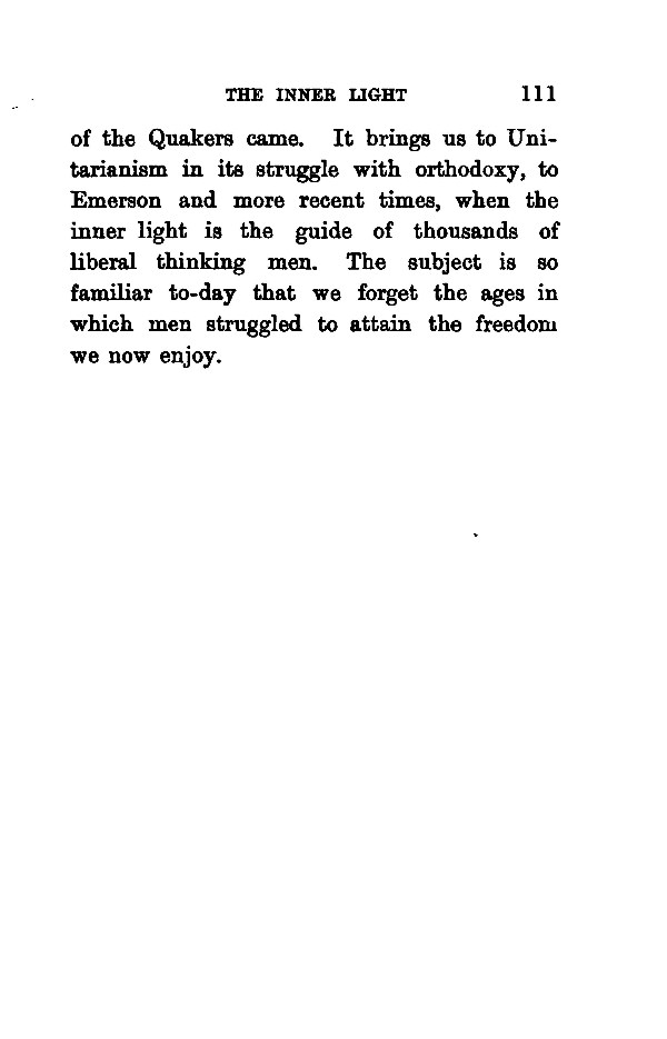 of the Quakers came. It brings us to Unitarianism in its struggle with orthodoxy, to Emerson and more recent times, when the inner light is the guide of thousands of liberal thinking men. The subject is so familiar to-day that we forget the ages in which men struggled to attain the freedom we now enjoy.