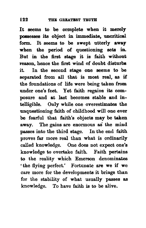 It seems to be complete when it merely possesses its object in immediate, uncritical form. It seems to be swept utterly away when the period of questioning sets in. But in the first stage it is faith without reason, hence the first wind of doubt disturbs it. In the second stage one seems to be separated from all that is most real, as if the foundations of life were being taken from under one's feet. Yet faith regains its composure and at last becomes stable and intelligible. Only while one overestimates the unquestioning faith of childhood will one ever be fearful that faith's objects may be taken away. The gains are enormous as the mind passes into the third stage. In the end faith proves far more real than what is ordinarily called knowledge. One does not expect one's knowledge to overtake faith. Faith pertains to the reality which Emerson denominates ' the flying perfect.' Fortunate are we if we care more for the developments it brings than for the stability of what usually passes as knowledge. To have faith is to be alive.