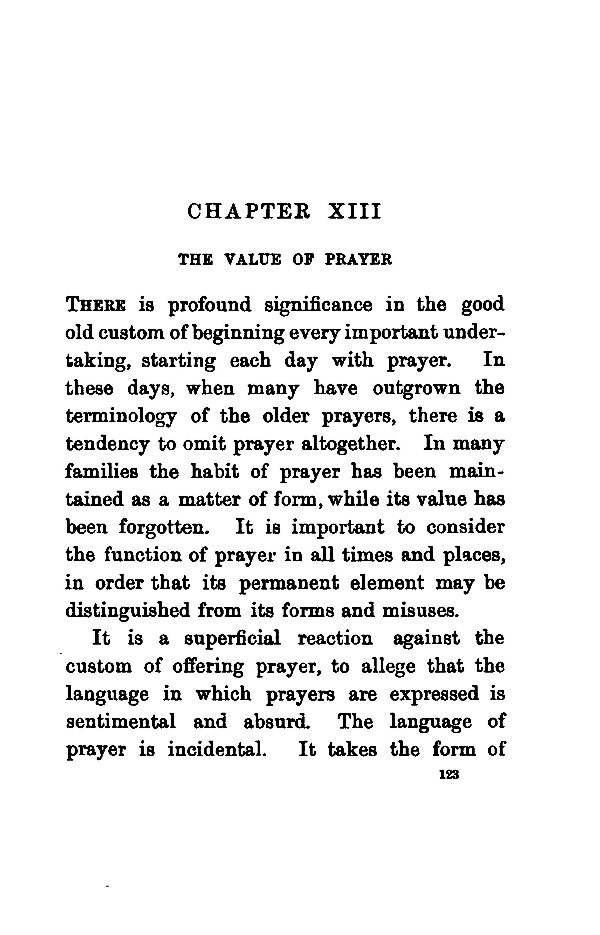 THERE is profound significance in the good old custom of beginning every important undertaking, starting each day with prayer. In these days, when many have outgrown the terminology of the older prayers, there is a tendency to omit prayer altogether. In many families the habit of prayer has been maintained as a matter of form, while its value has been forgotten. It is important to consider the function of prayer in all times and places, in order that its permanent element may be distinguished from its forms and misuses. It is a superficial reaction against the custom of offering prayer, to allege that the language in which prayers are expressed is sentimental and absurd. The language of prayer is incidental. It takes the form of