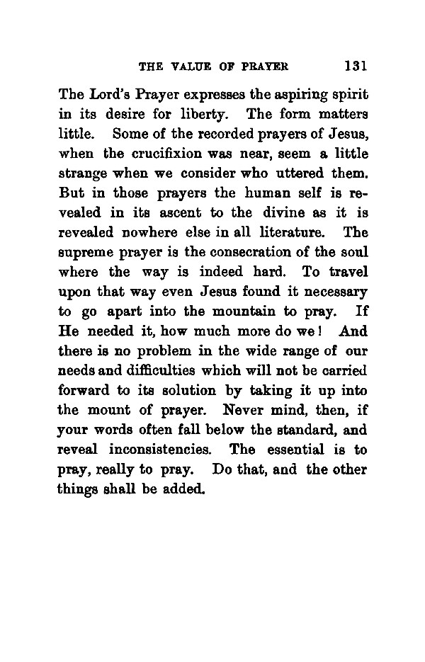 The Lord's Prayer expresses the aspiring spirit in its desire for liberty. The form matters little. Some of the recorded prayers of Jesus, when the crucifixion was near, seem a little strange when we consider who uttered them. But in those prayers the human self is revealed in its ascent to the divine as it is revealed nowhere else in all literature. The supreme prayer is the consecration of the soul where the way is indeed hard. To travel upon that way even Jesus found it necessary to go apart into the mountain to pray. If He needed it, how much more do we! And there is no problem in the wide range of our needs and difficulties which will not be carried forward to its solution by taking it up into the mount of prayer. Never mind, then, if your words often fall below the standard, and reveal inconsistencies. The essential is to pray, really to pray. Do that, and the other things shall be added.
