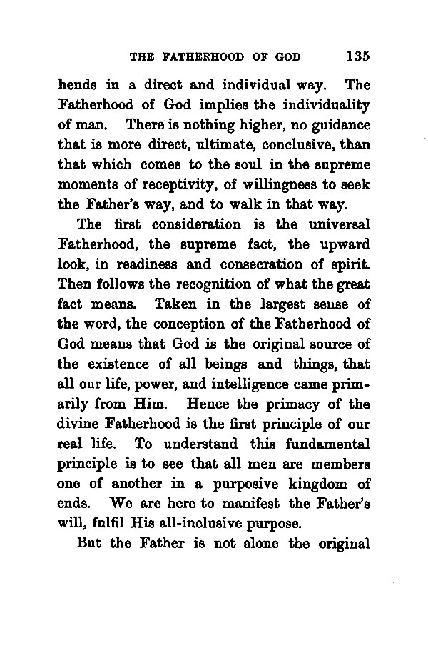 in a direct and individual way. The Fatherhood of God implies the individuality of man. There is nothing higher, no guidance that is more direct, ultimate, conclusive, than that which comes to the soul in the supreme moments of receptivity, of willingness to seek the Father's way, and to walk in that way. The first consideration is the universal Fatherhood, the supreme fact, the upward look, in readiness and consecration of spirit. Then follows the recognition of what the great fact means. Taken in the largest sense of the word, the conception of the Fatherhood of God means that God is the original source of the existence of all beings and things, that all our life, power, and intelligence came primarily from Him. Hence the primacy of the divine Fatherhood is the first principle of our real life. To understand this fundamental principle is to see that all men are members one of another in a purposive kingdom of ends. We are here to manifest the Father's will, fulfil His all-inclusive purpose. But the Father is not alone the original