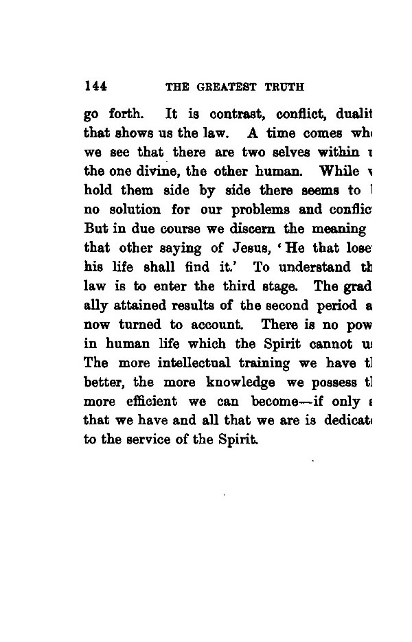 Contents - Foreword - Glad Tidings - The Greatest Truth - I and My Father Are One - Law of the Kingdom - Temporal and the Spiritual - Transfiguration - Meaning of Ideals - Spirituality - What Is Freedom? - Can We Change Our Dispositions? - The Inner Light - Faith - Value of Praye - Fatherhood of God - Law of Human Evolution - Wisdom - Harmony - Thoughts - Prejudice - What is the Higher Life? - God is Love - Power of Truth -
