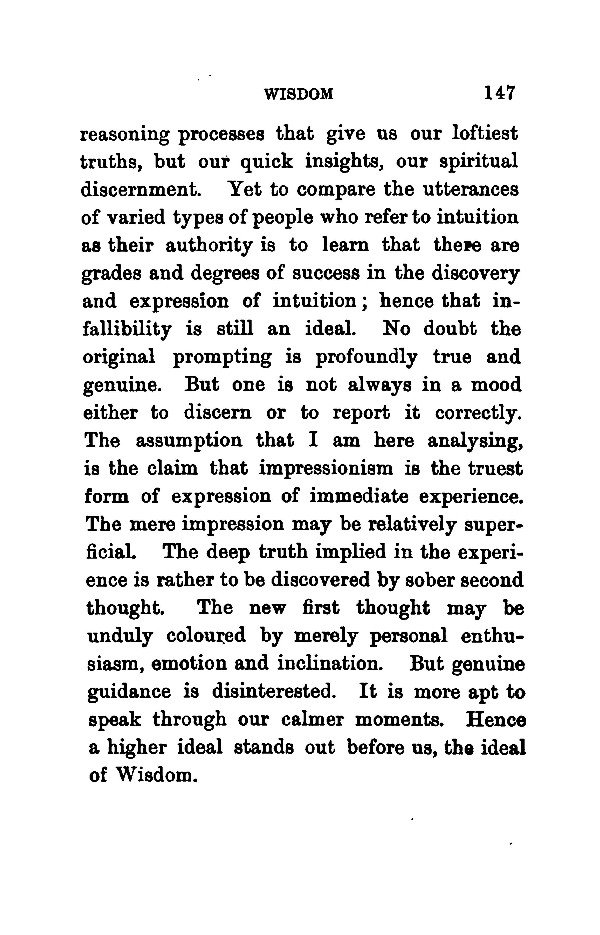 reasoning processes that give us our loftiest truths, but our quick insights, our spiritual discernment. Yet to compare the utterances of varied types of people who refer to intuition as their authority is to learn that there are grades and degrees of success in the discovery and expression of intuition , hence that infallibility is still an ideal. No doubt the original prompting is profoundly true and genuine. But one is not always in a mood either to discern or to report it correctly. The assumption that I am here analysing, is the claim that impressionism is the truest form of expression of immediate experience. The mere impression may be relatively superficial. The deep truth implied in the experience is rather to be discovered by sober second thought. The new first thought may be unduly coloured by merely personal enthusiasm, emotion and inclination. But genuine guidance is disinterested. It is more apt to speak through our calmer moments. Hence a higher ideal stands out before us, the ideal of Wisdom.