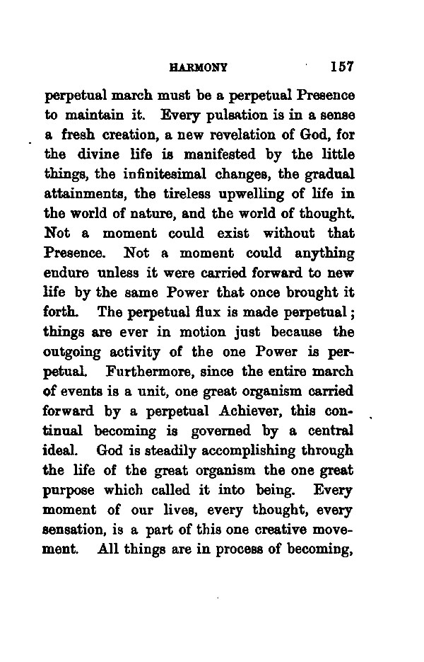 perpetual march must be a perpetual Presence to maintain it. Every pulsation is in a sense a fresh creation, a new revelation of God, for the divine life is manifested by the little things, the infinitesimal changes, the gradual attainments, the tireless upwelling of life in the world of nature, and the world of thought. Not a moment could exist without that Presence. Not a moment could anything endure unless it were carried forward to new life by the same Power that once brought it forth. The perpetual flux is made perpetual; things are ever in motion just because the outgoing activity of the one Power is perpetual. Furthermore, since the entire march of events is a unit, one great organism carried forward by a perpetual Achiever, this continual becoming is governed by a central ideal. God is steadily accomplishing through the life of the great organism the one great purpose which called it into being. Every moment of our lives, every thought, every sensation, is a part of this one creative movement. All things are in process of becoming,