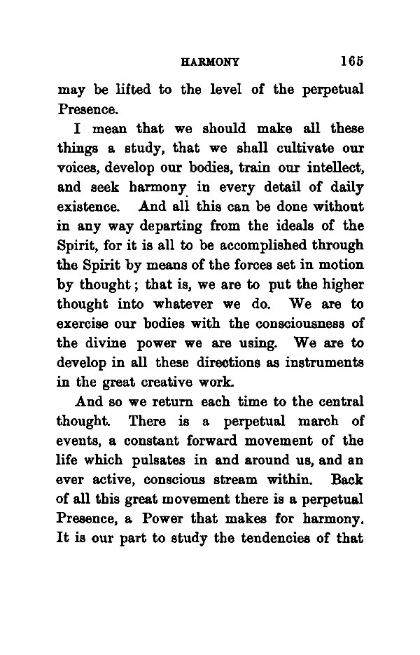 may be lifted to the level of the perpetual Presence. I mean that we should make all these things a study, that we shall cultivate our voices, develop our bodies, train our intellect, and seek harmony in every detail of daily existence. And all this can be done without in any way departing from the ideals of the Spirit, for it is all to be accomplished through the Spirit by means of the forces set in motion by thought; that is, we are to put the higher thought into whatever we do. We are to exercise our bodies with the consciousness of the divine power we are using. We are to develop in all these directions as instruments in the great creative work. And so we return each time to the central thought. There is a perpetual march of events, a constant forward movement of the life which pulsates in and around us, and an ever active, conscious stream within. Back of all this great movement there is a perpetual Presence, a Power that makes for harmony. It is our part to study the tendencies of that