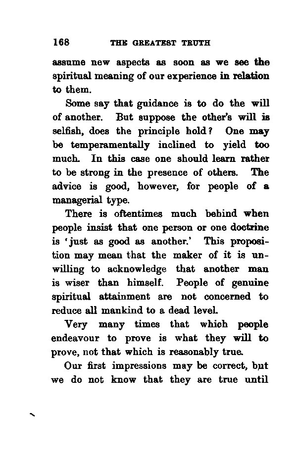 assume new aspects as soon as we see the spiritual meaning of our experience in relation to them. Some say that guidance is to do the will of another. But suppose the other's will is selfish, does the principle hold? One may be temperamentally inclined to yield too much. In this case one should learn rather to be strong in the presence of others. The advice is good, however, for people of a managerial type. There is oftentimes much behind when people insist that one person or one doctrine is 'just as good as another.' This proposition may mean that the maker of it is unwilling to acknowledge that another man is wiser than himself. People of genuine spiritual attainment are not concerned to reduce all mankind to a dead leveL Very many times that which people endeavour to prove is what they will to prove, not that which is reasonably true. Our first impressions may be correct, but we do not know that they are true until