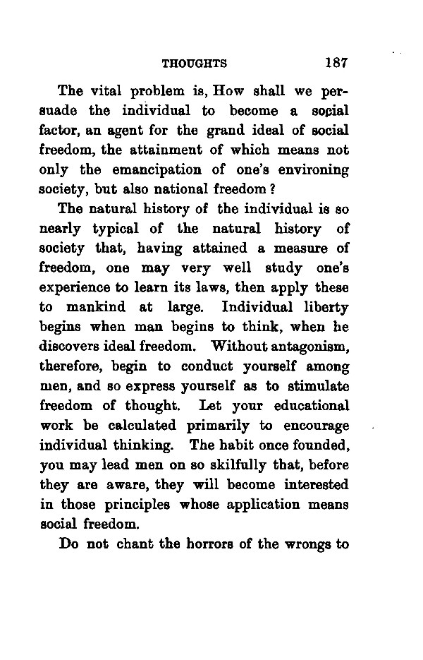 The vital problem is, How shall we persuade the individual to become a social factor, an agent for the grand ideal of social freedom, the attainment of which means not only the emancipation of one's environing society, but also national freedom? The natural history of the individual is so nearly typical of the natural history of society that, having attained a measure of freedom, one may very well study one's experience to learn its laws, then apply these to mankind at large. Individual liberty begins when man begins to think, when he discovers ideal freedom. Without antagonism, therefore, begin to conduct yourself among men, and so express yourself as to stimulate freedom of thought. Let your educational work be calculated primarily to encourage individual thinking. The habit once founded, you may lead men on so skilfully that, before they are aware, they will become interested in those principles whose application means social freedom. Do not chant the horrors of the wrongs to