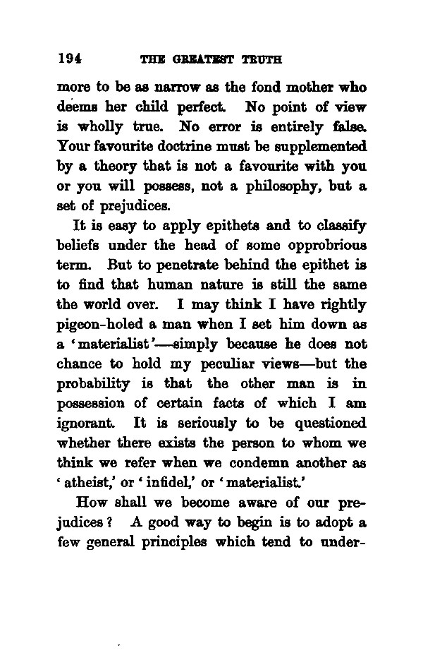 more to be as narrow as the fond mother who deems her child perfect. No point of view is wholly true. No error is entirely false. Your favourite doctrine must be supplemented by a theory that is not a favourite with you or you will possess, not a philosophy, but a set of prejudices. It is easy to apply epithets and to classify beliefs under the head of some opprobrious term. But to penetrate behind the epithet is to find that human nature is still the same the world over. I may think I have rightly pigeon-holed a man when I set him down as a ' materialist ' --- simply because he does not chance to hold my peculiar views --- but the probability is that the other man is in possession of certain facts of which I am ignorant. It is seriously to be questioned whether there exists the person to whom we think we refer when we condemn another as ' atheist,' or ' infidel,' or ` materialist.' How shall we become aware of our prejudices? A good way to begin is to adopt a few general principles which tend to undermine