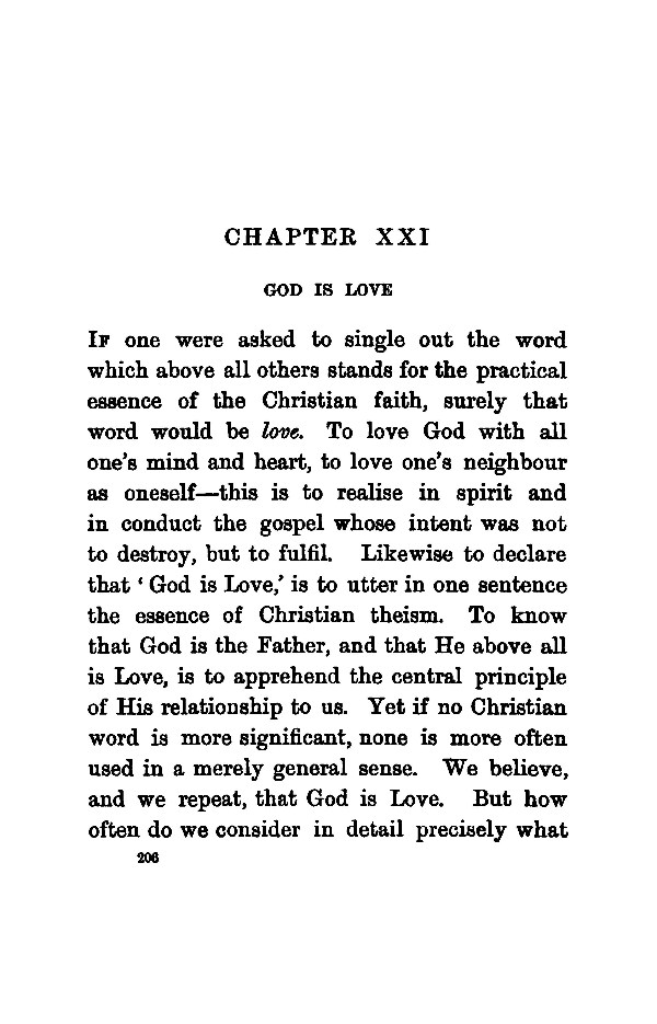 IF one were asked to single out the word which above all others stands for the practical essence of the Christian faith, surely that word would be love. To love God with all one's mind and heart, to love one's neighbour as oneself --- this is to realise in spirit and in conduct the gospel whose intent was not to destroy, but to fulfil. Likewise to declare that 'God is Love,' is to utter in one sentence the essence of Christian theism. To know that God is the Father, and that He above all is Love, is to apprehend the central principle of His relationship to us. Yet if no Christian word is more significant, none is more often used in a merely general sense. We believe, and we repeat, that God is Love. But how often do we consider in detail precisely what