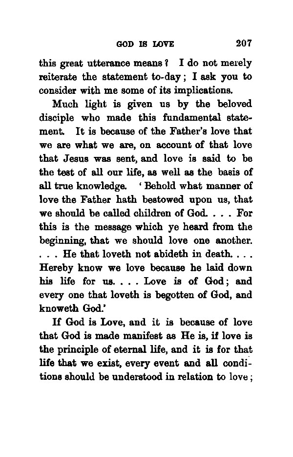 this great utterance means? I do not merely reiterate the statement to-day I ask you to consider with me some of its implications. Much light is given us by the beloved disciple who made this fundamental statement. It is because of the Father's love that we are what we are, on account of that love that Jesus was sent, and love is said to be the test of all our life, as well as the basis of all true knowledge. Behold what manner of love the Father hath bestowed upon us, that we should be called children of God. . . . For this is the message which ye heard from the beginning, that we should love one another. . . . He that loveth not abideth in death. . . . Hereby know we love because he laid down his life for us. . . . Love is of God and every one that loveth is begotten of God, and knoweth God.' If God is Love, and it is because of love that God is made manifest as He is, if love is the principle of eternal life, and it is for that life that we exist, every event and all conditions should be understood in relation to love