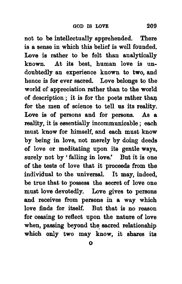 not to be intellectually apprehended. There is a sense in which this belief is well founded. Love is rather to be felt than analytically known. At its best, human love is undoubtedly an experience known to two, and hence is for ever sacred. Love belongs to the world of appreciation rather than to the world of description , it is for the poets rather than for the men of science to tell us its reality. Love is of persons and for persons. As a reality, it is essentially incommunicable , each must know for himself, and each must know by being in love, not merely by doing deeds of love or meditating upon its gentle ways, surely not by ' falling in love.' But it is one of the tests of love that it proceeds from the individual to the universal. It may, indeed, be true that to possess the secret of love one must love devotedly. Love gives to persons and receives from persons in a way which love finds for itself. But that is no reason for ceasing to reflect upon the nature of love when, passing beyond the sacred relationship which only two may know, it shares its