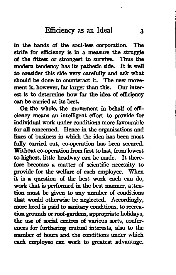 in the hands of the soul-less corporation. The strife for efficiency is in a measure the struggle of the fittest or strongest to survive. Thus the modern tendency has its pathetic side. It is well to consider this side very carefully and ask what should be done to counteract it. The new movement is, however, far larger than this. Our interest is to determine how far the idea of efficiency can be carried at its best.