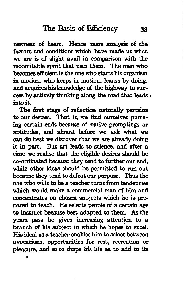 newness of heart. Hence mere analysis of the factors and conditions which have made us what we are is of slight avail in comparison with the indomitable spirit that uses them. The man who becomes efficient is the one who starts his organism in motion, who keeps in motion, learns by doing, and acquires his knowledge of the highway to success by actively thinking along the road that leads into it.