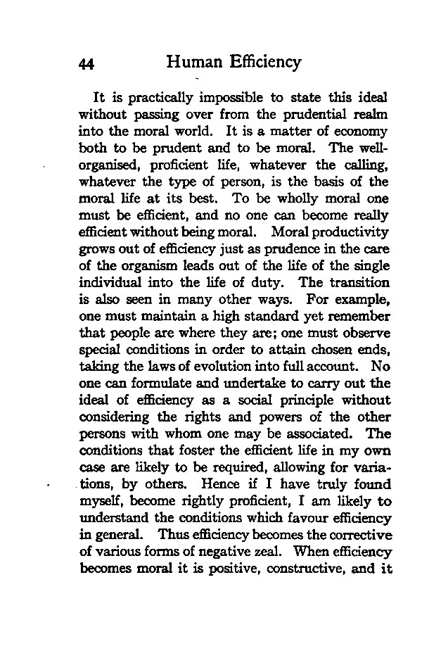 It is practically impossible to state this ideal without passing over from the prudential realm into the moral world. It is a matter of economy both to be prudent and to be moral. The well organised, proficient life, whatever the calling, whatever the type of person, is the basis of the moral life at its best. To be wholly moral one must be efficient, and no one can become really efficient without being moral. Moral productivity grows out of efficiency just as prudence in the care of the organism leads out of the life of the single individual into the life of duty. The transition is also seen in many other ways. For example, one must maintain a high standard yet remember that people are where they are; one must observe special conditions in order to attain chosen ends, taking the laws of evolution into full account. No one can formulate and undertake to carry out the ideal of efficiency as a social principle without considering the rights and powers of the other persons with whom one may be associated. The conditions that foster the efficient life in my own case are likely to be required, allowing for variations, by others. Hence if I have truly found myself, become rightly proficient, I am likely to understand the conditions which favour efficiency in general. Thus efficiency becomes the corrective of various forms of negative zeal. When efficiency becomes moral it is positive, constructive, and it