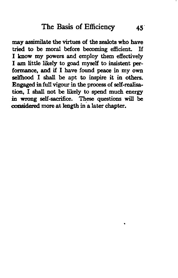 may assimilate the virtues of the zealots who have tried to be moral before becoming efficient. If I know my powers and employ them effectively I am little likely to goad myself to insistent performance, and if I have found peace in my own selfhood I shall be apt to inspire it in others. Engaged in full vigour in the process of self-realisation, I shall not be likely to spend much energy in wrong self-sacrifice. These questions will be considered more at length in a later chapter.