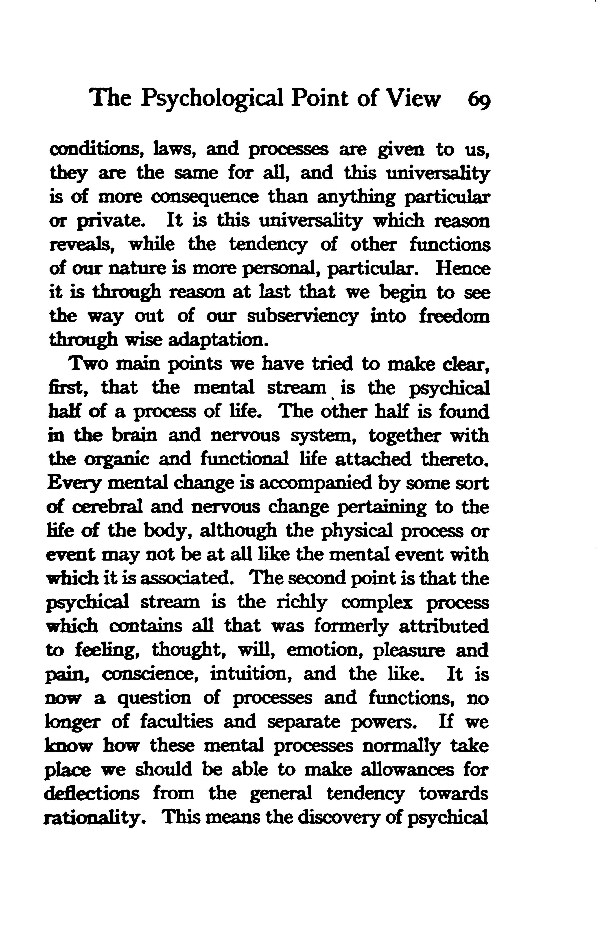Two main points we have tried to make clear, first, that the mental stream is the psychical half of a process of life. The other half is found in the brain and nervous system, together with the organic and functional life attached thereto. Every mental change is accompanied by some sort of cerebral and nervous change pertaining to the life of the body, although the physical process or event may not be at all like the mental event with which it is associated. The second point is that the psychical stream is the richly complex process which contains all that was formerly attributed to feeling, thought, will, emotion, pleasure and pain, conscience, intuition, and the like. It is now a question of processes and functions, no longer of faculties and separate powers. If we know how these mental processes normally take place we should be able to make allowances for deflections from the general tendency towards rationality. This means the discovery of psychical
