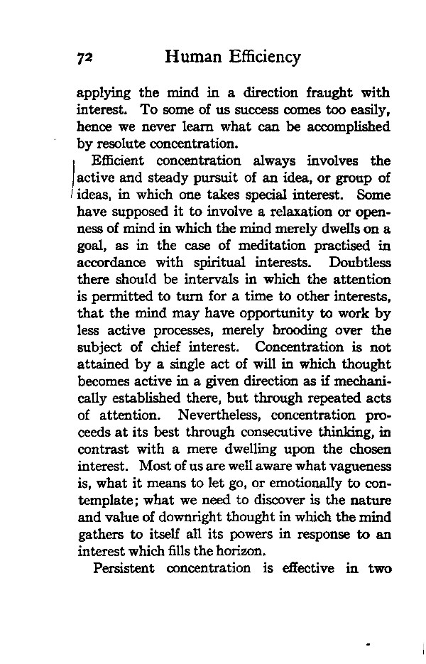 Efficient concentration always involves the active and steady pursuit of an idea, or group of ideas, in which one takes special interest. Some have supposed it to involve a relaxation or openness of mind in which the mind merely dwells on a goal, as in the case of meditation practised in accordance with spiritual interests. Doubtless there should be intervals in which the attention is permitted to turn for a time to other interests, that the mind may have opportunity to work by less active processes, merely brooding over the subject of chief interest. Concentration is not attained by a single act of will in which thought becomes active in a given direction as if mechanically established there, but through repeated acts of attention. Nevertheless, concentration proceeds at its best through consecutive thinking, in contrast with a mere dwelling upon the chosen interest. Most of us are well aware what vagueness is, what it means to let go, or emotionally to contemplate; what we need to discover is the nature and value of downright thought in which the mind gathers to itself all its powers in response to an interest which fills the horizon.