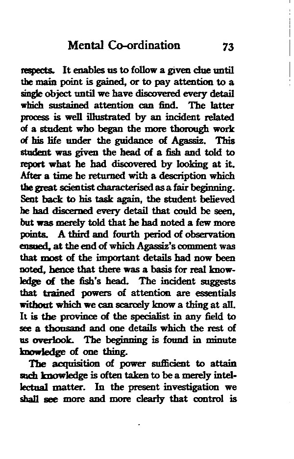 respects. It enables us to follow a given clue until the main point is gained, or to pay attention to a single object until we have discovered every detail which sustained attention can find. The latter process is well illustrated by an incident related of a student who began the more thorough work of his life under the guidance of Agassiz. This student was given the head of a fish and told to report what he had discovered by looking at it. After a time he returned with a description which the great scientist characterised as a fair beginning. Sent back to his task again, the student believed he had discerned every detail that could be seen, but was merely told that he had noted a few more points. A third and fourth period of observation ensued, at the end of which Agassiz's comment was that most of the important details had now been noted, hence that there was a basis for real knowledge of the fish's head. The incident suggests that trained powers of attention are essentials without which we can scarcely know a thing at all. It is the province of the specialist in any field to see a thousand and one details which the rest of us overlook. The beginning is found in minute knowledge of one thing.