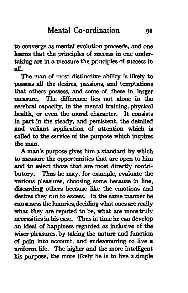A man's purpose gives him a standard by which to measure the opportunities that are open to him and to select those that are most directly contributory. Thus he may, for example, evaluate the various pleasures, choosing some because in line, discarding others because like the emotions and desires they run to excess. In the same manner he can assess the luxuries, deciding what ones are really what they are reputed to be, what are more truly necessities in his case. Thus in time he can develop an ideal of happiness regarded as inclusive of the wiser pleasures, by taking the nature and function of pain into account, and endeavouring to live a uniform life. The higher and the more intelligent his purpose, the more likely he is to live a simple