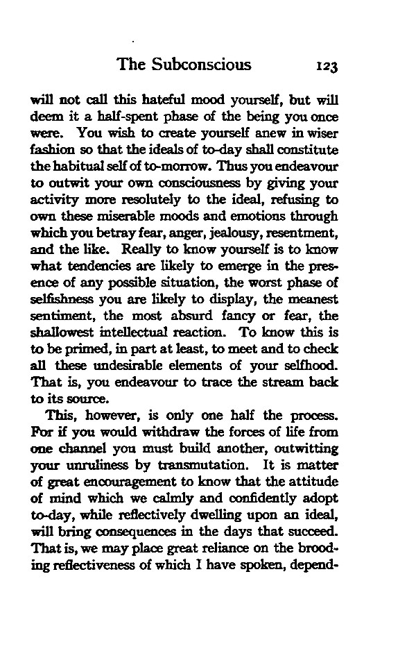 will not call this hateful mood yourself, but will deem it a half-spent phase of the being you once were. You wish to create yourself anew in wiser fashion so that the ideals of to-day shall constitute the habitual self of to-morrow. Thus you endeavour to outwit your own consciousness by giving your activity more resolutely to the ideal, refusing to own these miserable moods and emotions through which you betray fear, anger, jealousy, resentment, and the like. Really to know yourself is to know what tendencies are likely to emerge in the presence of any possible situation, the worst phase of selfishness you are likely to display, the meanest sentiment, the most absurd fancy or fear, the shallowest intellectual reaction. To know this is to be primed, in part at least, to meet and to check all these undesirable elements of your selfhood. That is, you endeavour to trace the stream back to its source.