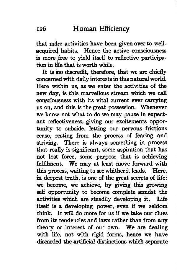 It is no discredit, therefore, that we are chiefly concerned with daily interests in this natural world. Here within us, as we enter the activities of the new day, is this marvelous stream which we call consciousness with its vital current ever carrying us on, and this is the great possession. Whenever we know not what to do we may pause in expectant reflectiveness, giving our excitements opportunity to subside, letting our nervous frictions cease, resting from the process of fearing and striving. There is always something in process that really is significant, some aspiration that has not lost force, some purpose that is achieving fulfillment. We may at least move forward with this process, waiting to see whither it leads. Here, in deepest truth, is one of the great secrets of life: we become, we achieve, by giving this growing self opportunity to become complete amidst the activities which are steadily developing it. Life itself is a developing power, even if we seldom think. It will do more for us if we take our clues from its tendencies and laws rather than from any theory or interest of our own. We are dealing with life, not with rigid forms, hence we have discarded the artificial distinctions which separate