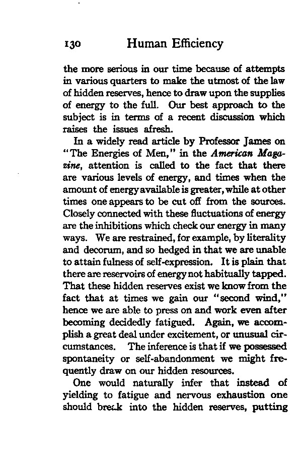 In a widely read article by Professor James on "The Energies of Men," in the American Magazine, attention is called to the fact that there are various levels of energy, and times when the amount of energy available is greater, while at other times one appears to be cut off from the sources. Closely connected with these fluctuations of energy are the inhibitions which check our energy in many ways. We are restrained, for example, by literality and decorum, and so hedged in that we are unable to attain fulness of self-expression. It is plain that there are reservoirs of energy not habitually tapped. That these hidden reserves exist we know from the fact that at times we gain our "second wind," hence we are able to press on and work even after becoming decidedly fatigued. Again, we accomplish a great deal under excitement, or unusual circumstances. The inference is that if we possessed spontaneity or self-abandonment we might frequently draw on our hidden resources.
