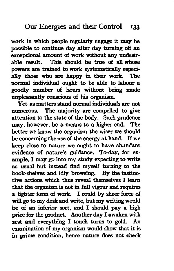 Yet as matters stand normal individuals are not numerous. The majority are compelled to give attention to the state of the body. Such prudence may, however, be a means to a higher end. The better we know the organism the wiser we should be concerning the use of the energy at hand. If we keep close to nature we ought to have abundant evidence of nature's guidance. To-day, for example, I may go into my study expecting to write as usual but instead find myself turning to the book-shelves and idly browsing. By the instinctive actions which thus reveal themselves I learn that the organism is not in full vigour and requires a lighter form of work. I could by sheer force of will go to my desk and write, but my writing would be of an inferior sort, and I should pay a high price for the product. Another day I awaken with zest and everything I touch turns to gold. An examination of my organism would show that it is in prime condition, hence nature does not check